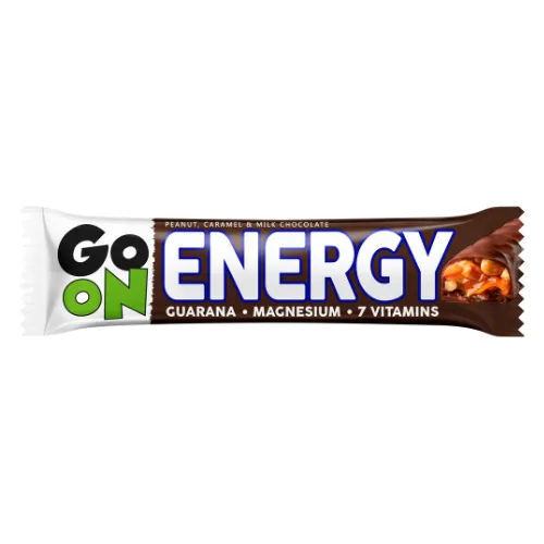 Baton GO ON Energy z orzeszkami arachidowymi i karmelem, oblany mleczną czekoladą, to pyszny baton dla aktywnych, który wygrywa w przedbiegach ze zwykłymi batonikami. Wzbogacony w witaminy, magnez i guaranę, dostarcza ważnych składników odżywczych dla osób aktywnych fizycznie. Stworzony dla wszystkich, którzy kochają sport i… orzechową chwilę przyjemności z nutą karmelu.