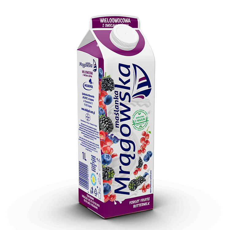 Maślanka Mrągowska wieloowocowa z owocami leśnymi (1L) to napój mleczny składający się z maślanki, mleka, cukru, wsadu owocowego z owocami leśnymi, mleka w proszku, skrobi modyfikowanej oraz żywych kultur bakterii mlekowych. Jest to produkt pasteryzowany, zawierający owoce i cukier, często o zawartości tłuszczu ok. 1,5%.
