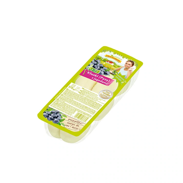Pyzy (kluski na parze) z jagodami marki Grześkowiak to gotowe do spożycia, puszyste kluski drożdżowe z nadzieniem owocowym.