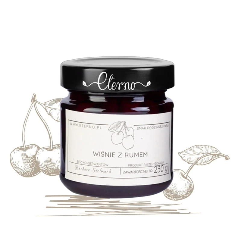 Kwaskowe, drylowane wiśnie z dodatkiem rumu, wyśmienite do wypieków na bazie ciemnej czekolady, lodów, kopotów lub do wyjadania bezpośrednio ze słoiczka.